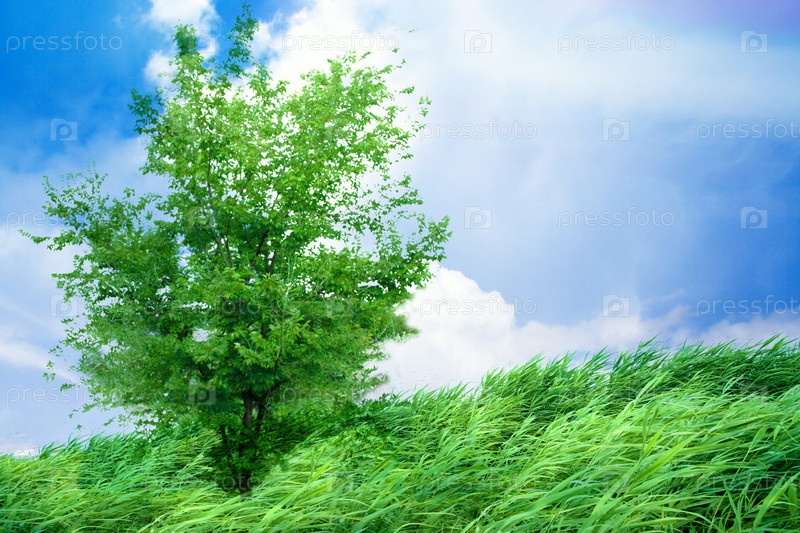 Дерево и пушистая трава на фоне неба