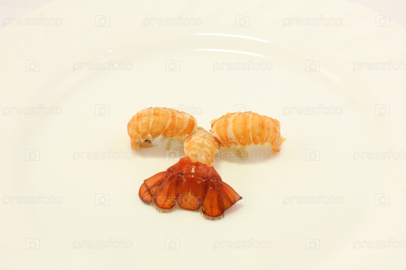 Три красных, вкусных, вареных и хвостовых лап креветок лежат на белом фоне