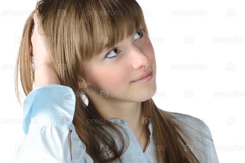 Симпатичная светловолосая девушка держит руку у головы, изолированная на белом фоне