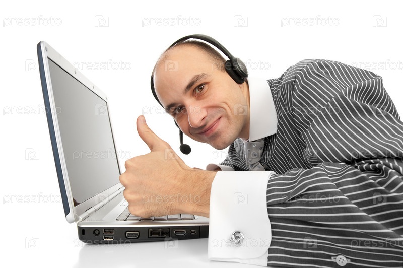 Дружелюбный телефонный оператор с ноутбуком на белом фоне
