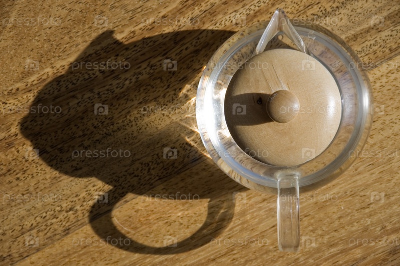 Прозрачная чашка с водой на деревянном полу. Вид сверху