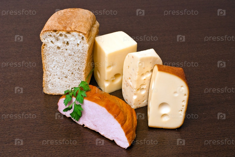 Пшеничный хлеб, копченая ветчина и три вида сыра