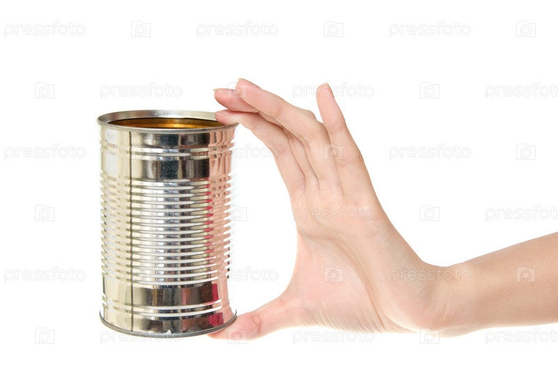 Жестяная банка в руке на белом фоне