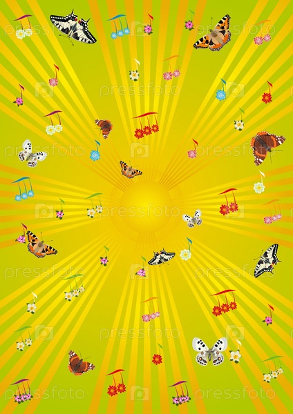 Абстрактный желтый фон с бабочками и нотами
