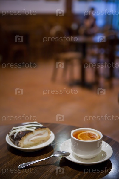 Чай и десерт на столике в кафе