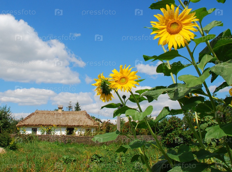 Подсолнечники на фоне деревенского дома