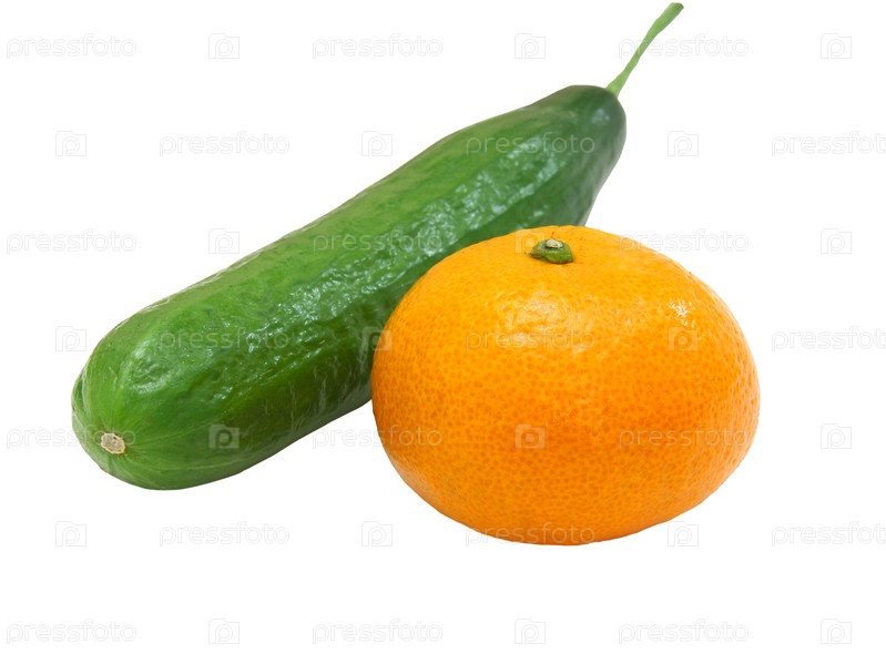 Огурец и мандарин на белом фоне