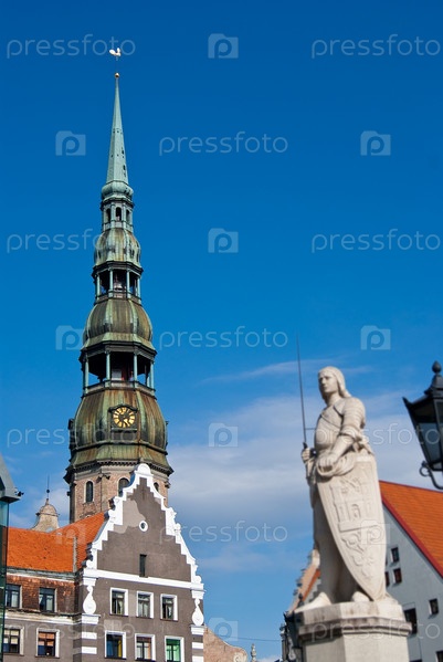 Рига, столица Латвии, статуя Роланда и башня Петра