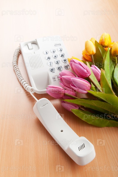 Белый телефон и букет тюльпанов