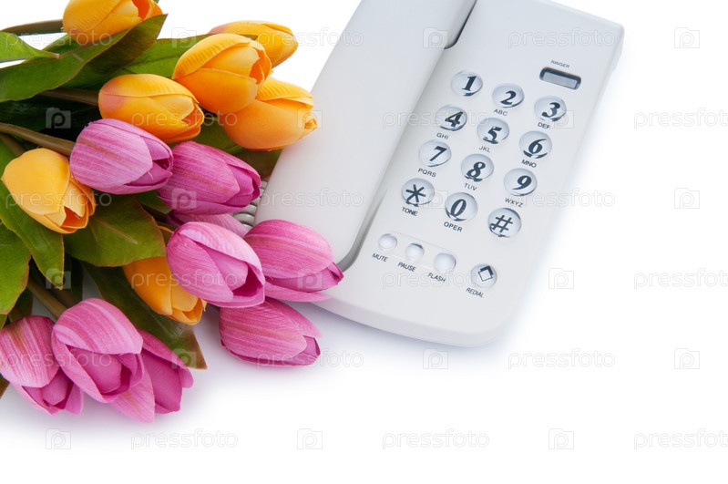Белый телефон и букет тюльпанов