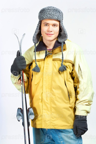 Молодой лыжник на белом фоне