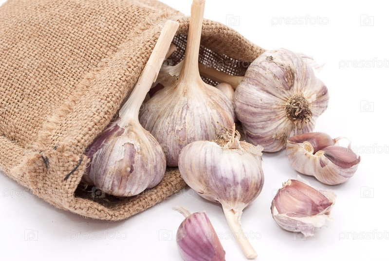 Мешочек с чесноком на белом фоне