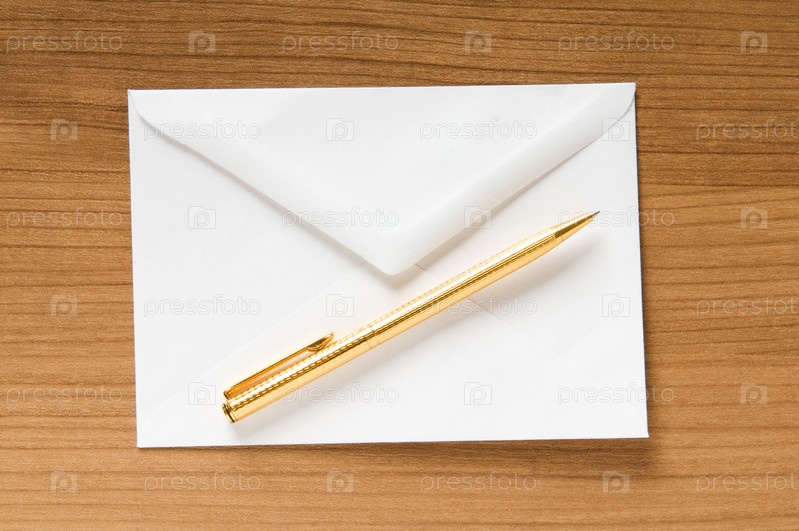 Конверт для писем и ручка, лежащие на столе
