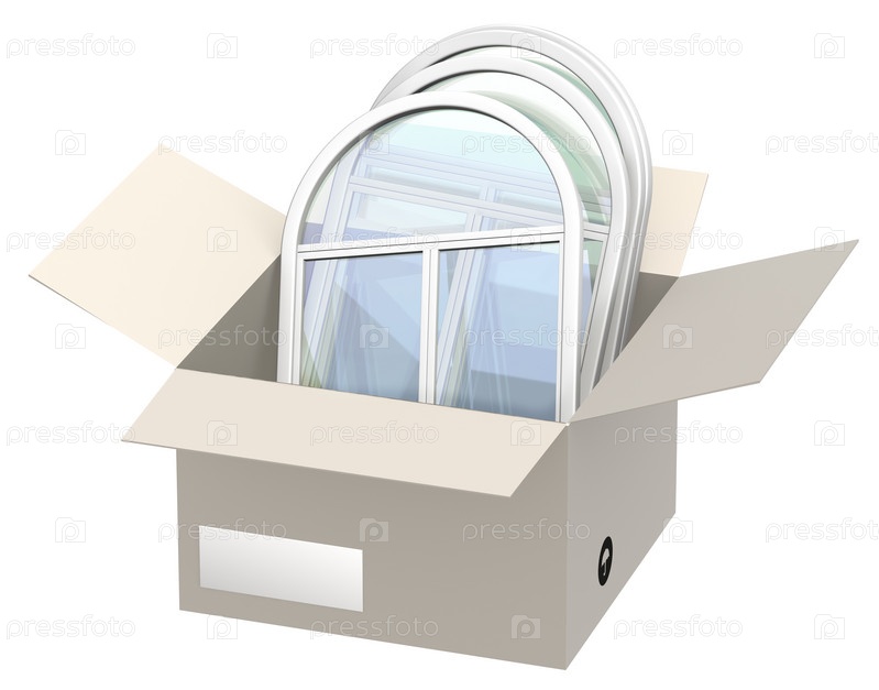 Оконные рамы в коробке на белом фоне