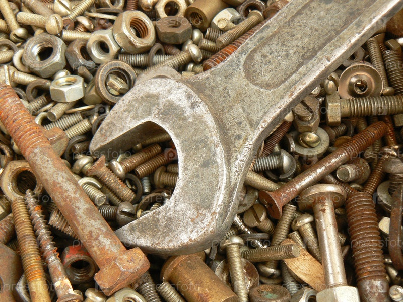 Гаечный ключ на фоне ржавых гвоздей и шурупов