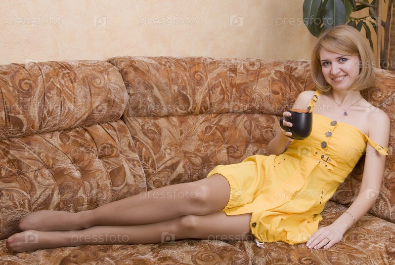 Девушка с кружкой чай сидит на диване