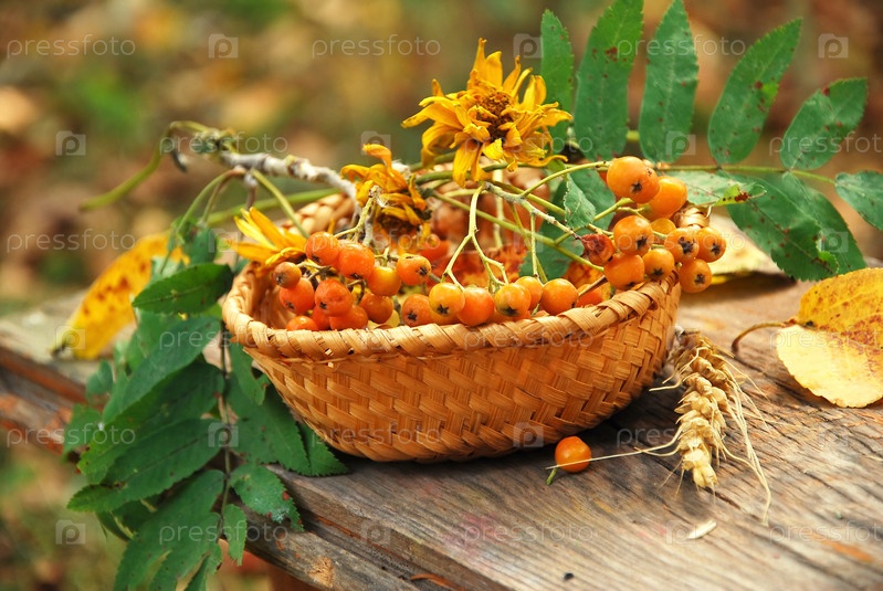 Ветка рябины в плетеной корзинке