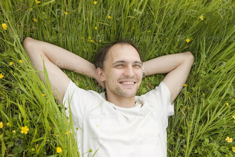 Счастливый молодой человек отдыхает на траве