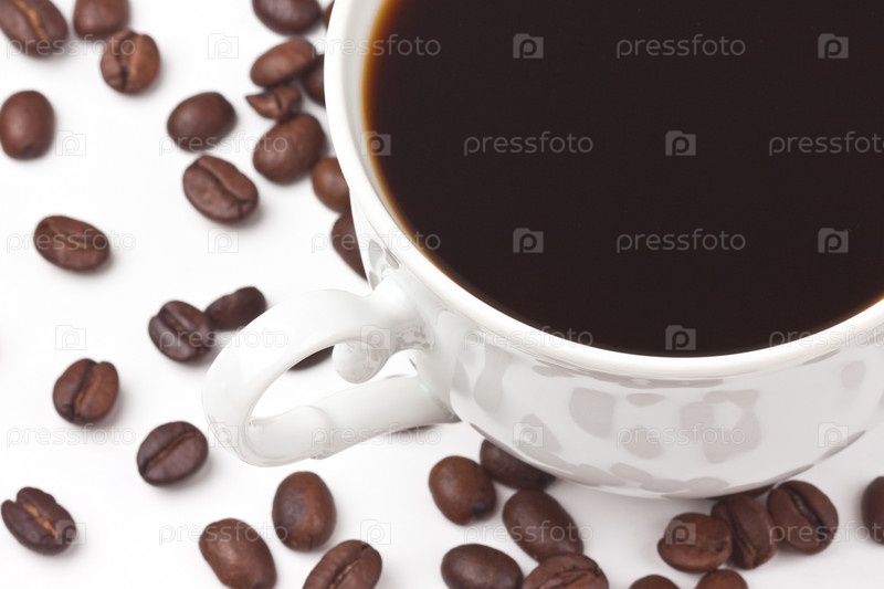 Белая чашка с кофе на фоне из кофейных зерен
