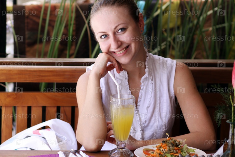 Улыбающаяся девушка в кафе пьет сок