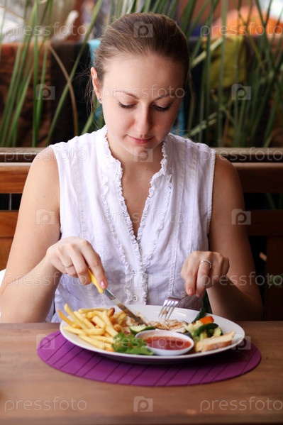 Женщина обедает в кафе