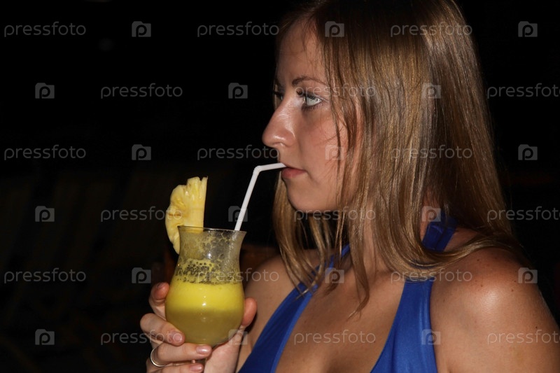 Загорелая девушка пьет сок
