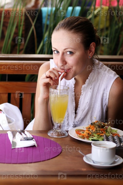 Счастливая женщина пьет сок в кафе