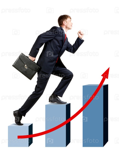 Молодой бизнесмен движется по столбикам диаграммы вверх
