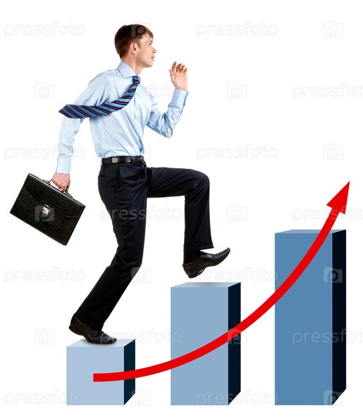 Молодой бизнесмен движется по столбикам диаграммы вверх