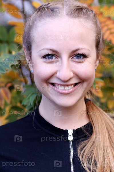 Портрет молодой улыбающейся девушки на фоне осенних листьев