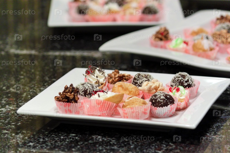 Тарелки с маленькими пирожными на столе