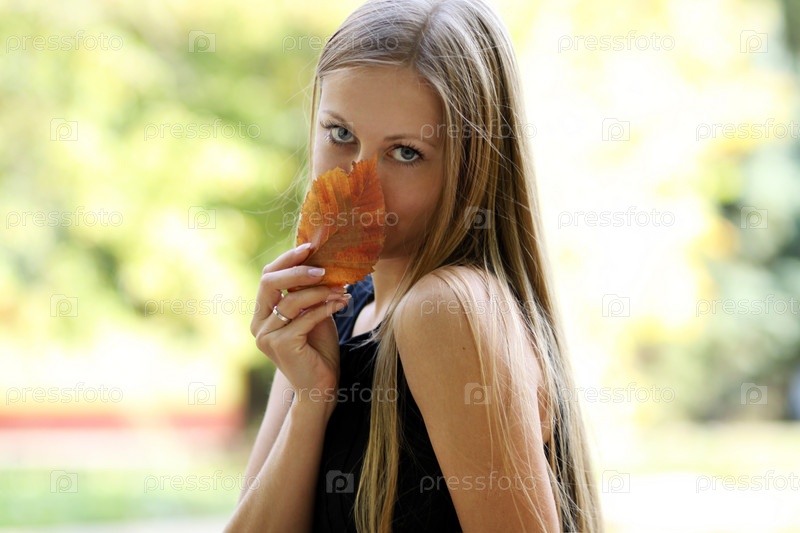 Портрет девушки, которая прикрывает рот осеннем листочком