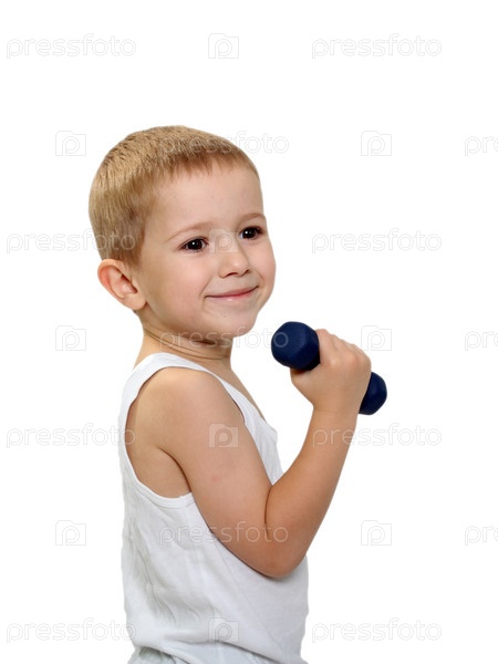 Здоровый образ жизни ребенок, занимающийся упражнениями с весом гантели
