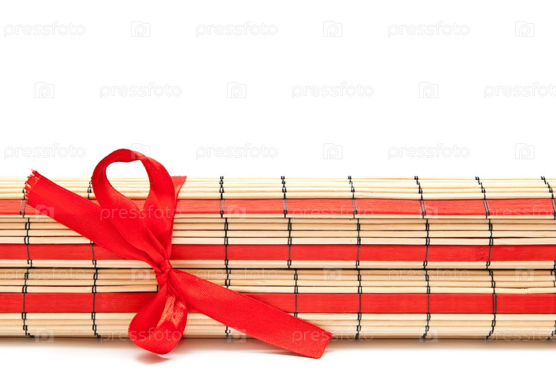 Красный бамбуковый коврик с бантом на белом фоне