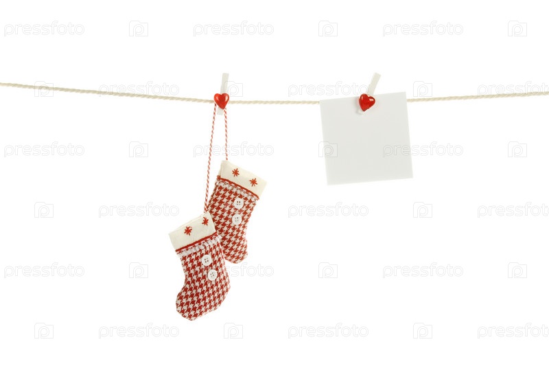 Декоративные валенки и лист бумаги висят на веревке на белом фоне