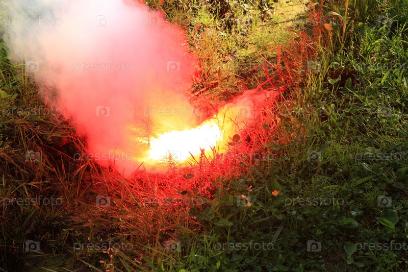 Красный фонарик горит в зеленой траве, утренняя роса покрывает капли