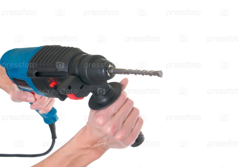 Электрическая дрель в руках на белом фоне