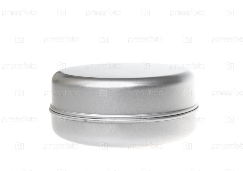 Круглая металлическая коробочка на белом фоне