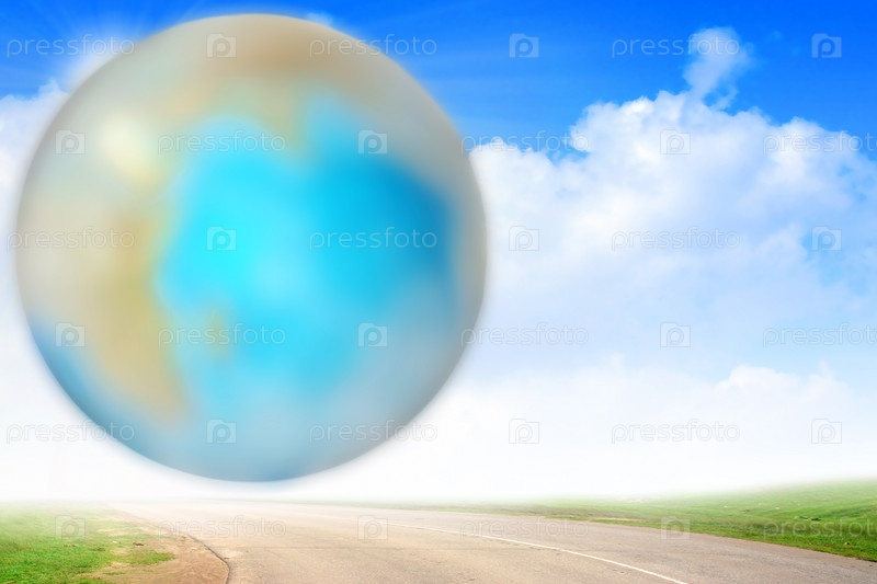 Земной шар на фоне неба над дорогой