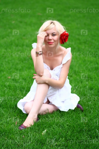 Красивая женщина в белом платье сидит на траве в парке
