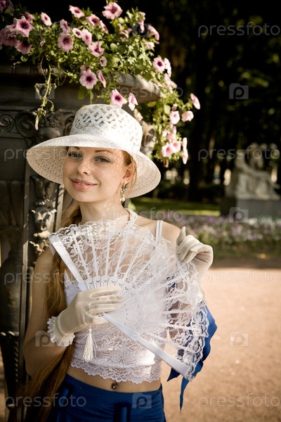 Молодая дама в белой шляпе в парке