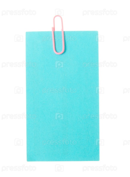 Голубой лист бумаги с розовой скрепкой на белом фоне