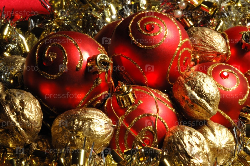 Новогодняя (рождественская) открытка с елочными игрушками и позолоченными орехами