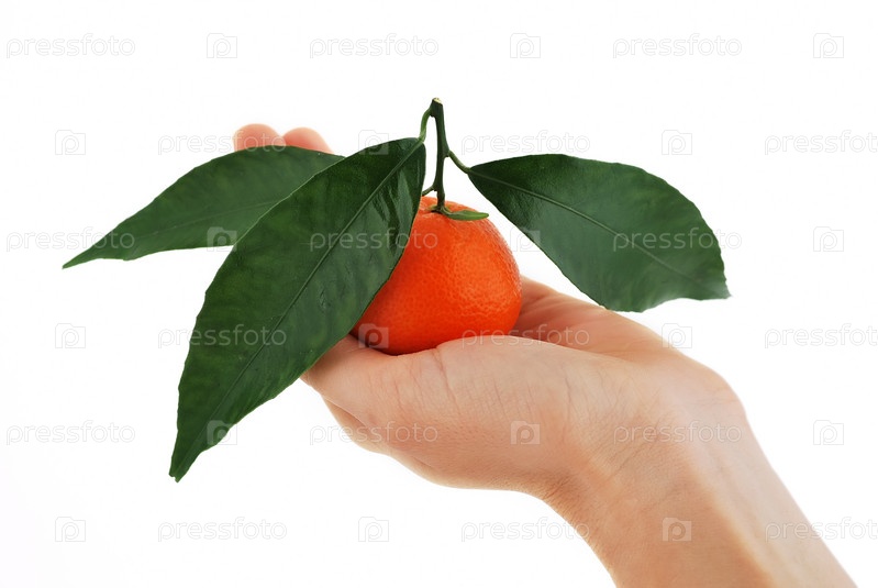 Мандарин с зелеными листьями в руке