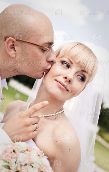 Счастливые жених и невеста в парке