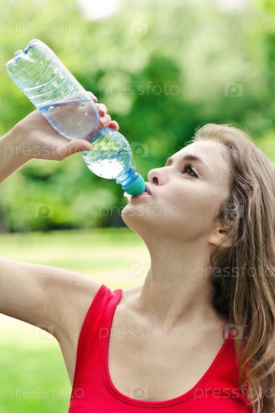 Девочка пьет воду в парке после занятий спортом