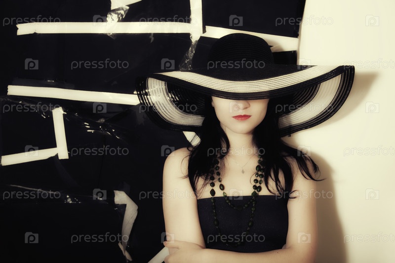 Портрет женщины на черном фоне в летней шляпе