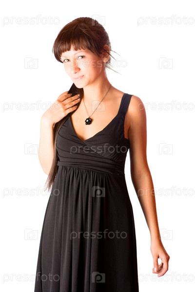 Молодая темноволосая женщина в черном платье, изолированная на белом фоне