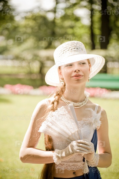 Молодая дама с веером и в белой шляпе идет по парку