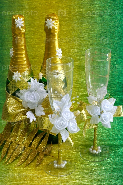 Две бутылки шампанского и два бокала, украшенные золотыми бантами и белыми цветами, на желто-зеленом фоне